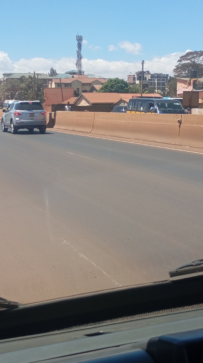 An elevated highway scene captured from inside a vehicle. A silver SUV is driving on the left lane while a dark-colored van occupies the right. Both vehicles are separated by a long concrete barrier. Behind the barrier, the urban landscape shows various buildings, a cell tower, and trees under a bright sky with scattered clouds. The road is dry and stretches into the distance. The vehicle's dashboard is visible at the bottom.