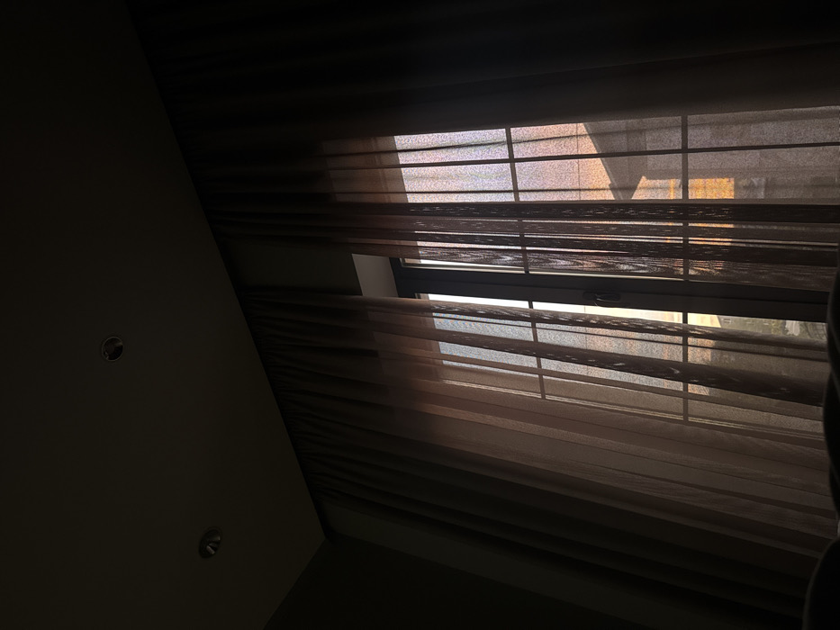 The image depicts an interior view of a room looking towards a large window during either sunrise or sunset, evidenced by the warm, orange-pink light emanating from outside. The room's ceiling is dark and features two recessed circular light fixtures. Heavy, dark brown opaque curtains are pulled back, framing a set of lighter, sheer brown or beige curtains that are drawn across a multi-paned window. These sheer curtains diffuse the exterior light, creating soft vertical patterns. Through the window, the silhouette of an adjacent building's roofline and upper structure is faintly visible, bathed in the warm light. A window handle is discernable on the central vertical mullion. No individuals are present. The scene is located in Yerevan, Armenia.