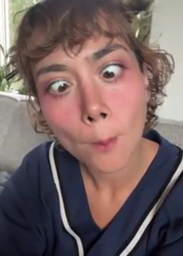 A woman is seated indoors, looking directly at the camera. She has short, curly brown hair with bangs, and her hair is partially tied up. She wears bright pink makeup around her eyes and cheeks. She is wearing a navy blue button-down shirt with white piping. Initially, she has a neutral expression, but then she makes a fish face, rolls her eyes, and finally smiles broadly, revealing her teeth. The background consists of a couch, a window, and some greenery visible outside. The overall setting appears casual.