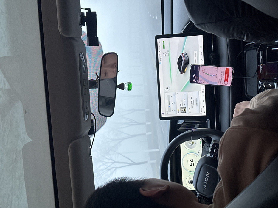 The scene depicts the interior of an AION brand vehicle in motion, viewed from a rear passenger's perspective looking forward