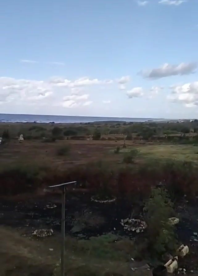 landscape with a view of the ocean. The foreground features a grassy area with some shrubbery and a paved walkway. There is some evidence of burnt areas, possibly from controlled fires. The background reveals the ocean under a partly cloudy sky. The ocean is visible as a horizon line. Overall, the video appears to be a natural, outdoor scene.