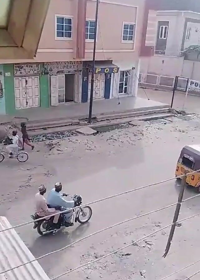 street scene in a town. A man rides a bicycle on the street. Then a motorcycle with two men on it passes by. A yellow three-wheeled vehicle is also on the street. Later, a woman carrying something on her head walks across the street. The buildings along the street appear to be businesses, some with closed doors. Power lines run along the street. The street is a mix of dirt and paved surfaces with visible potholes. The footage seems to be taken from an elevated position, likely from a building or balcony overlooking the street.