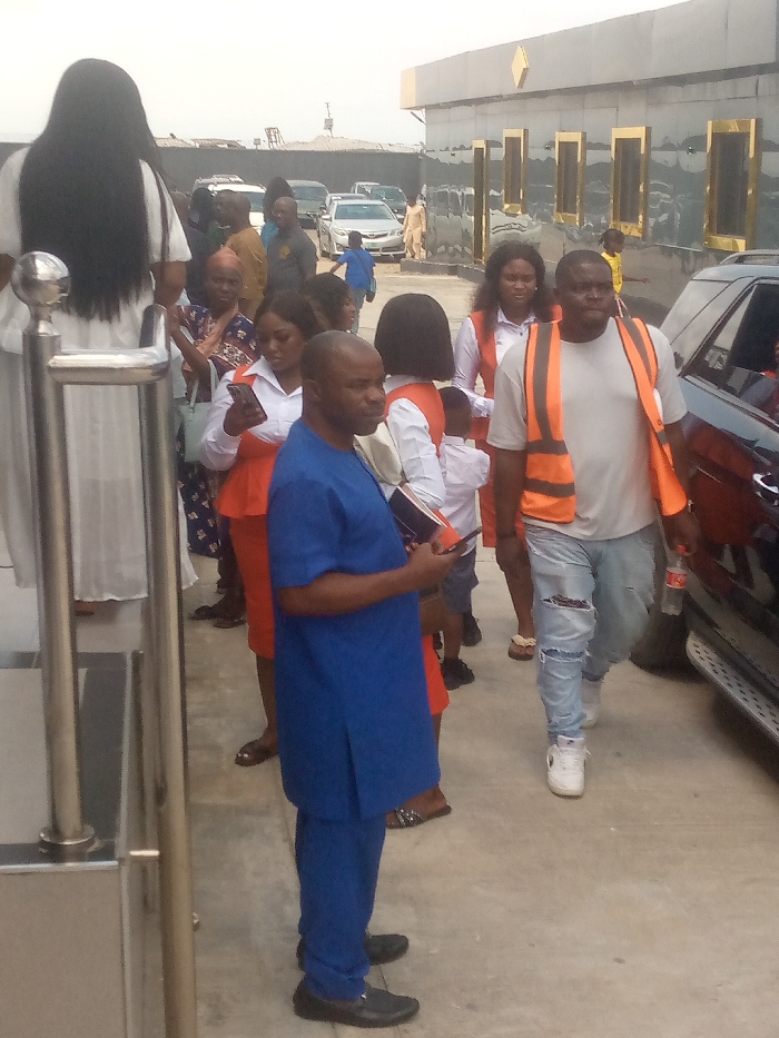The scene depicts an outdoor gathering on a paved area in Ado, Nigeria, adjacent to a modern building. In the foreground left, a person with long black hair, dressed in white, is partially visible behind a silver metal railing. Centered in the foreground, a man in a royal blue kaftan and trousers stands, holding a mobile phone in his left hand and a book or tablet in his right. To his right, a man wearing a grey t-shirt, orange safety vest, light blue ripped jeans, and white sneakers walks rightward, holding a plastic Coca-Cola bottle in his right hand. The midground features several individuals, including multiple women in white shirts and orange skirts, with one woman actively looking at a mobile phone. A small child is also present among them. In the background, various vehicles, including a silver sedan and a dark SUV, are parked or in motion. The prominent structure in the background is a modern building with a grey facade, featuring several vertical golden rectangular panels and a distinct gold diamond-shaped logo on its upper section. The sky overhead is overcast.