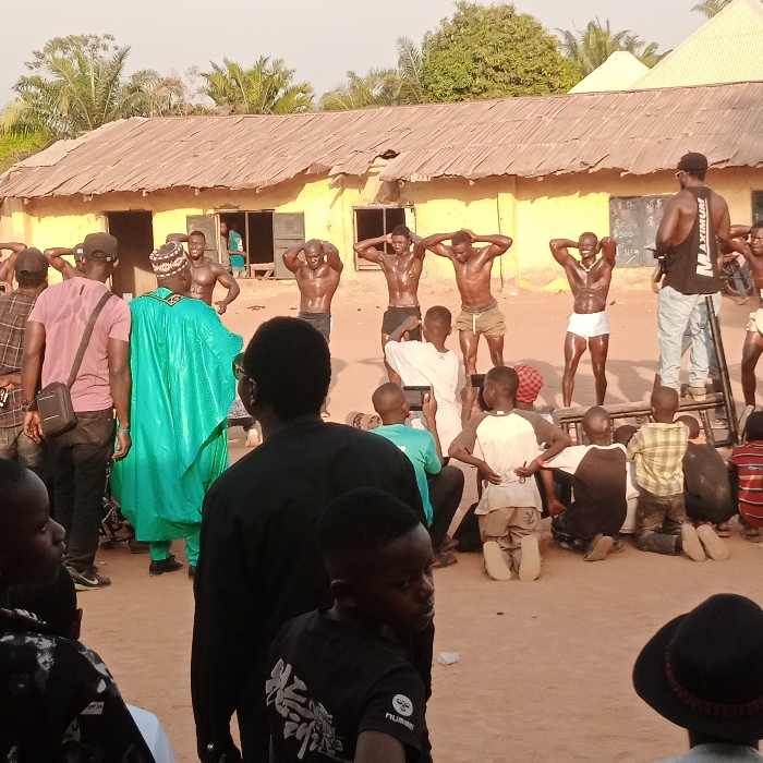 An outdoor scene in Akwanga, Nigeria, depicts a public gathering in front of a single-story, light brown building with a corrugated metal roof. Six muscular men, shirtless and appearing oiled, stand in a line facing an unseen audience, posing with their hands behind their heads. They wear various shorts including dark, olive, and white briefs. To the left of the posing men, a man in a bright teal traditional flowing garment and a patterned cap observes the proceedings, alongside another man in a maroon t-shirt and dark pants with a shoulder bag. To the far right, a man in a black tank top labeled "MAXIMUM" and light blue jeans stands on a metal ladder, operating what appears to be video recording equipment, pointed towards the posing men. In the midground and foreground, numerous spectators, predominantly children, are gathered, with several kneeling on the dirt ground. Some children are holding smartphones, seemingly recording the event. A board with handwritten figures like "$0," "$500," and "$1500" is visible on the building wall to the right of the posing men. Green foliage is present behind the building.