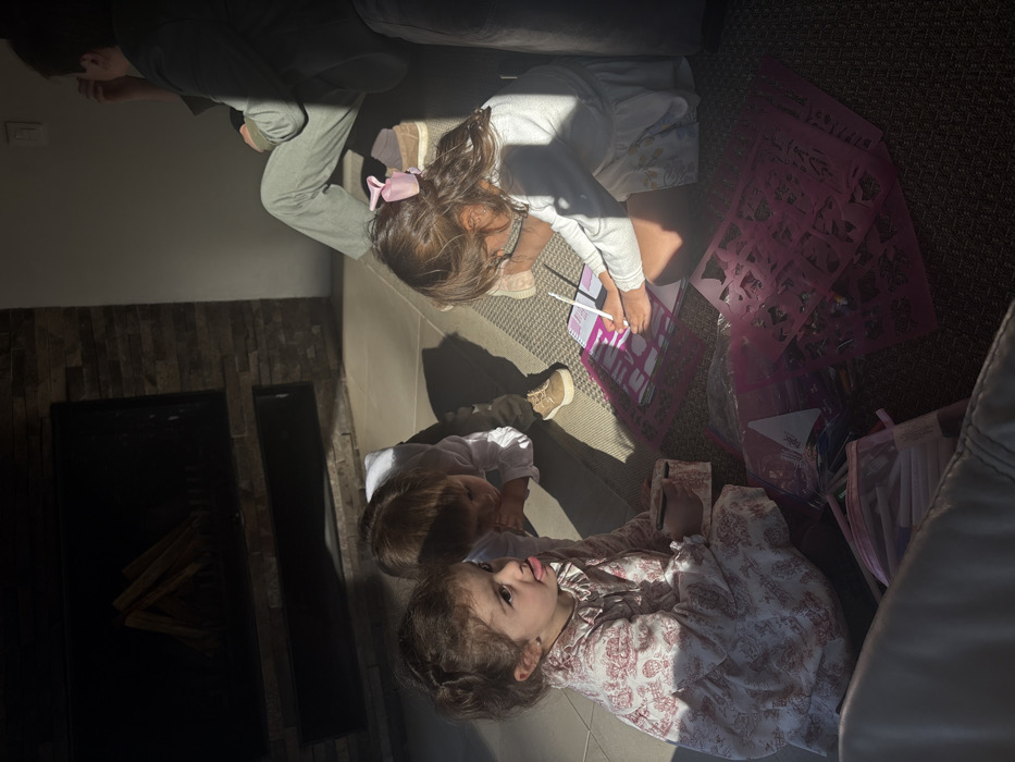 The scene depicts an indoor living space in Valle de Bravo, Mexico, illuminated by a strong, directional natural light source, creating distinct areas of sunlight and shadow. Three young children are engaged in activity on a dark textured rug, which is partially on a light-colored tiled floor. In the foreground to the left, a young girl with curly dark brown hair, wearing a light-colored long-sleeved dress with a reddish-brown toile pattern, is seated on the rug. She holds a small, round, patterned container in her hands and looks upwards and to the left with her tongue slightly extended. To her right and slightly behind, a second child with light brown hair, wearing a white long-sleeved shirt, light-colored pants, and light brown suede-like shoes, crouches on the floor, leaning forward and observing the activity. To the right of the second child, a third young girl with long brown hair and a pink bow is seated on the rug. She is wearing a light-colored long-sleeved top and patterned shorts or a skirt, actively drawing with a white stylus or marker on a pink spiral notebook. Several pink plastic stencils featuring various shapes and letters are spread on the rug around her, along with a translucent pouch containing multiple markers. In the background, a modern fireplace with a black interior, containing faux logs, is built into a stone-clad wall. To the far right, the lower body of an adult, wearing light green trousers and light brown shoes, is partially visible, seated on a light-colored sofa.