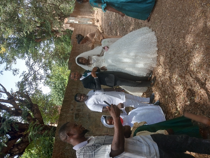 The image displays an outdoor scene in Pankshin, Nigeria, under bright daylight. Eight individuals are present on ground covered with dry brown leaves. A low, weathered wall spans the mid-ground, backed by dense green trees and foliage, with a large, gnarled tree prominent on the upper left. In the center-right, a male subject wears a dark suit, white shirt, and teal bow tie, adjusting his left cuff. Immediately to his right, a female subject wears a white, elaborate wedding gown and a white veil. To the left of the male subject, another male subject stands in a white traditional top and dark trousers. Behind the female in the wedding gown, a female subject in a light-colored traditional dress and dark head wrap appears to attend to the bride, with her left hand near the bride's left shoulder. To the far left, a male subject in a striped polo shirt and dark trousers holds a white smartphone horizontally, pointing it towards the central figures. Two child subjects are partially visible in the foreground near him: one in a white dress with a red detail near the chest, and another in a green dress. On the far right, a female subject in a teal dress is partially visible, moving out of frame.