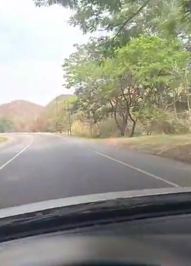A first-person perspective video shot from the driver's seat of a moving car. The car is traveling on a two-lane paved road with a solid white line separating the lanes. The road curves slightly to the left. On the left side of the road is a hillside covered with dry vegetation. On the right side of the road are trees and tall grass. Overhead power lines are visible. The sky is overcast. The car's dashboard and windshield are visible in the foreground.