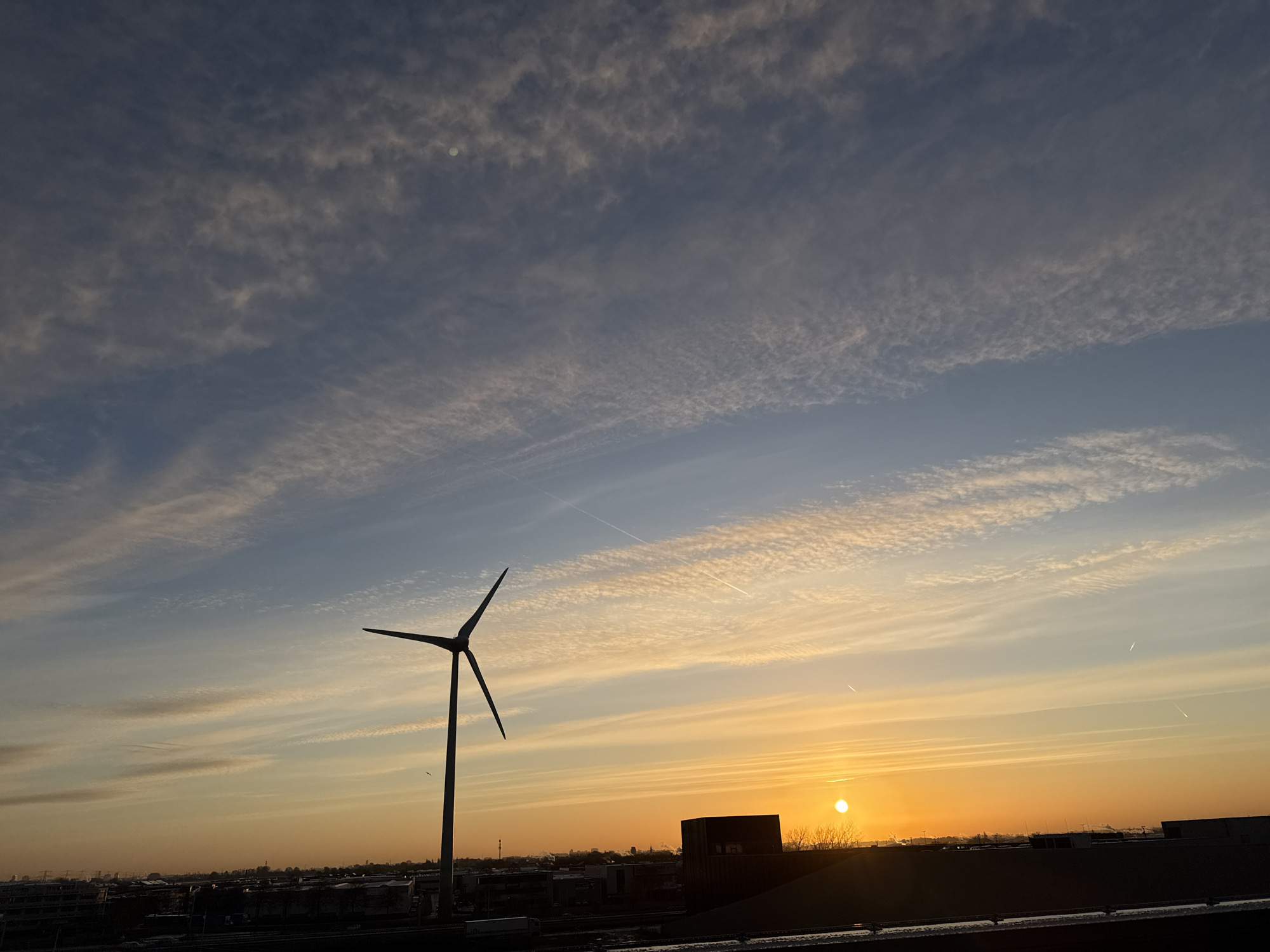 An outdoor wide shot depicts a sunset or sunrise over Maasdijk, Netherlands. The sky occupies approximately two-thirds of the frame, displaying a gradient from light blue in the upper left to a vibrant orange and yellow near the horizon on the right. Wispy, horizontally elongated clouds are present across the sky, with denser formations in the upper portions. Multiple linear contrails from aircraft are visible against the sky. The sun, a distinct bright yellow-orange orb, is positioned above the horizon in the lower right quadrant. The lower third of the image shows a silhouetted urban or industrial landscape. A tall, three-bladed wind turbine stands prominently on the left, its structure and blades rendered in dark silhouette against the brighter sky. Its blades appear stationary. To the right of the wind turbine, various buildings with distinct rectangular forms, consistent with industrial or commercial structures, are visible in silhouette. A prominent dark, block-like building is situated in the mid-ground, just below the sun. Bare tree branches are discernible near the horizon on the far right. The immediate foreground is a dark, undefined horizontal band, possibly a rooftop edge or railing from the vantage point of the photographer. No individuals, explicit actions, or direct interactions are visible.