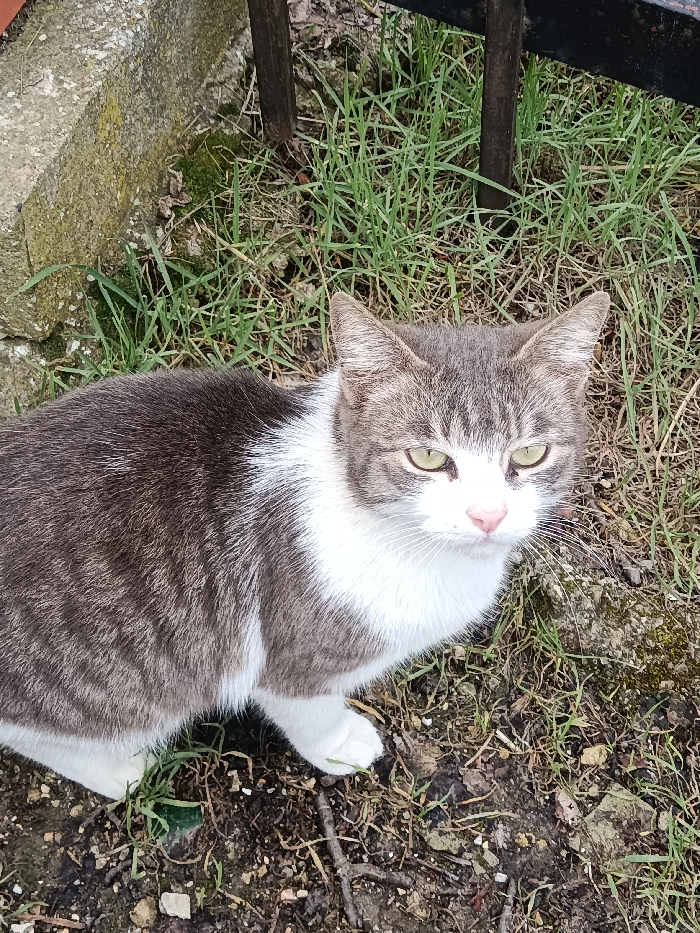 - "A domestic short-haired cat, exhibiting a gray tabby pattern on its back and head with a white chest, belly, and paws, is positioned facing the viewer" by FM-71LUI2, licensed under CC BY 4.0