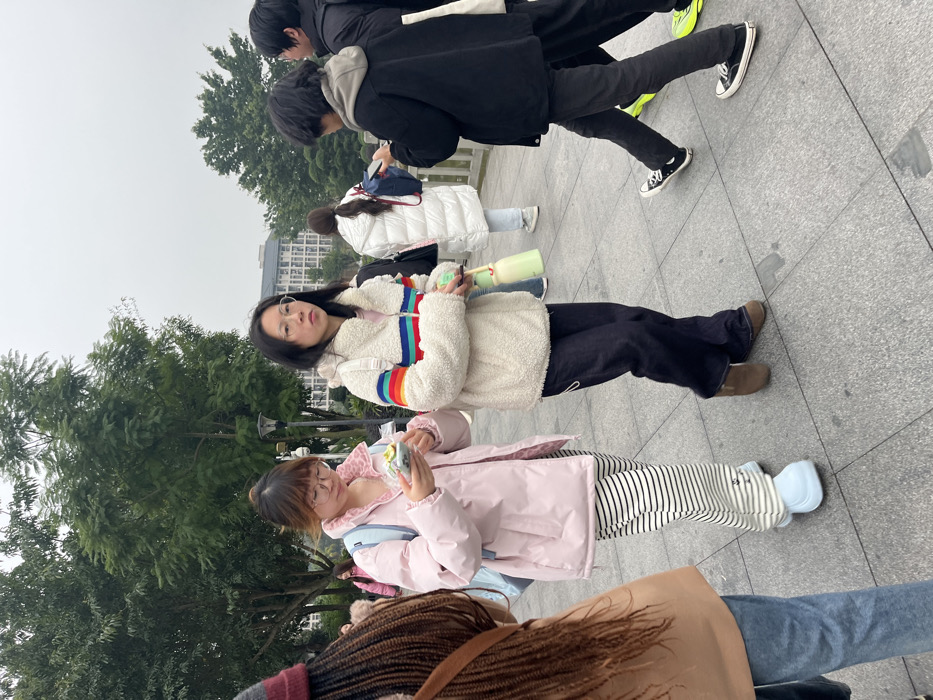 A group of people stands on a gray concrete surface with trees in the background. One woman wears a pink coat and striped pants while looking at a phone. Another woman beside her has a white jacket with rainbow stripes and holds a colorful item. Several people walk past in darker jackets and pants. The sky is overcast. The shot is taken from a slightly elevated angle.