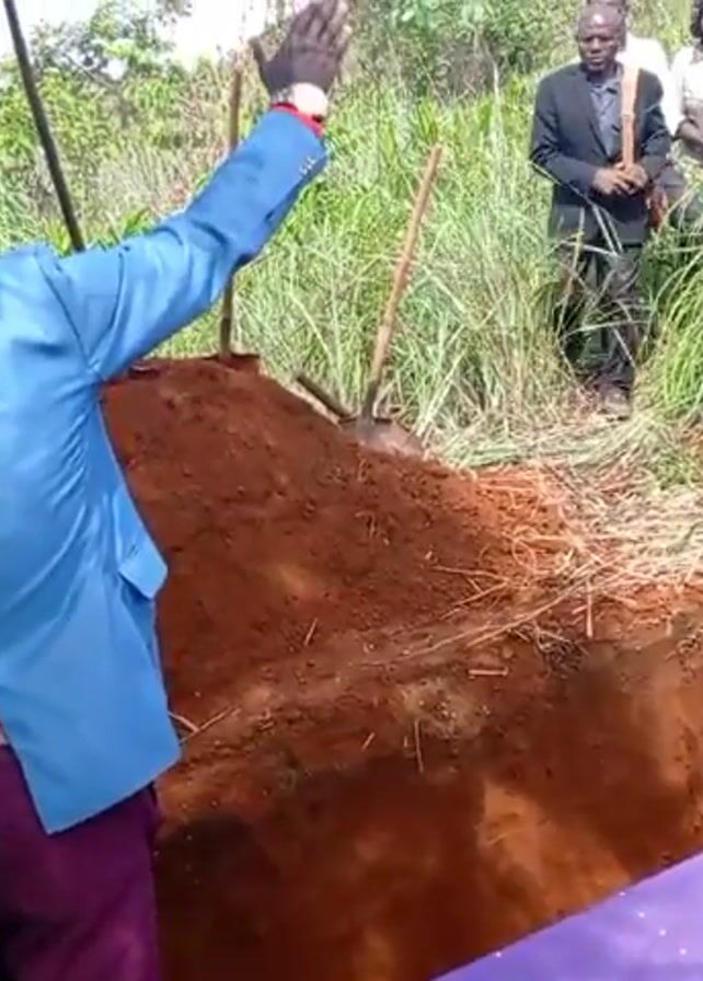 The scene depicts a funeral ceremony outdoors. A man dressed in a light blue jacket and purple pants stands near an open grave, his right arm raised. A purple casket with a cross on top is placed on the ground near the grave. Several other people, including men in suits and women in patterned dresses, are standing in the background, near some tall grass. One of the men is holding a shovel. The ground is mostly covered in dirt and scattered dried grass.