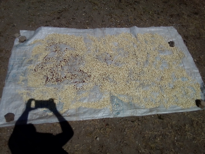 A white tarp is spread on the ground, holding piles of light beige beans or seeds