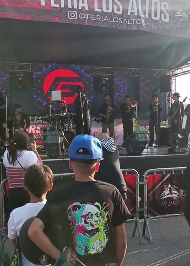 Certainly! Here's a detailed description of the scene in the video: The video shows a live musical performance at an outdoor event titled "Feria Los Altos," as indicated by the banner above the stage. A band consisting of several musicians is performing on a stage equipped with lighting and a large LED screen displaying a logo. Musicians are playing instruments like saxophone, trombone, drums, and guitar. Several people, including women and children, are standing in front of the stage, watching the performance. One child wears a blue baseball cap and a black shirt with a panda graphic on the back. The area is divided by red and silver metal barriers. The overall atmosphere appears to be that of a fair or festival with live entertainment.