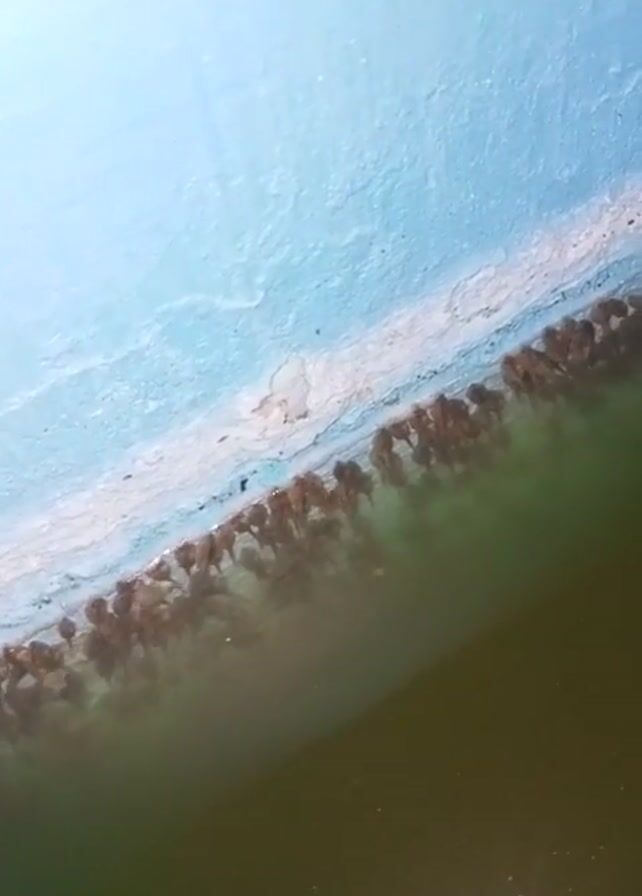 The camera is at an angle looking down at an edge where blue and light grey water meets murky green-brown water. The edge between the two water colors is lined with brown or black rocks. The light grey water is on the left of the screen, and the murky water is on the right. The camera seems to be fixed in place.