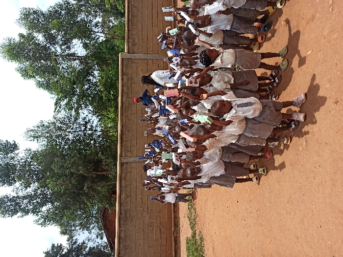 A large group of children in school uniforms stands outdoors, holding small, colorful objects in their raised hands. They are arranged in rows, with a teacher or supervisor standing behind them. The scene appears to be a schoolyard or outdoor area next to a brick wall. Trees and vegetation are visible in the background. The lighting is bright, suggesting a sunny day. The ground is reddish-brown, possibly dirt or clay.