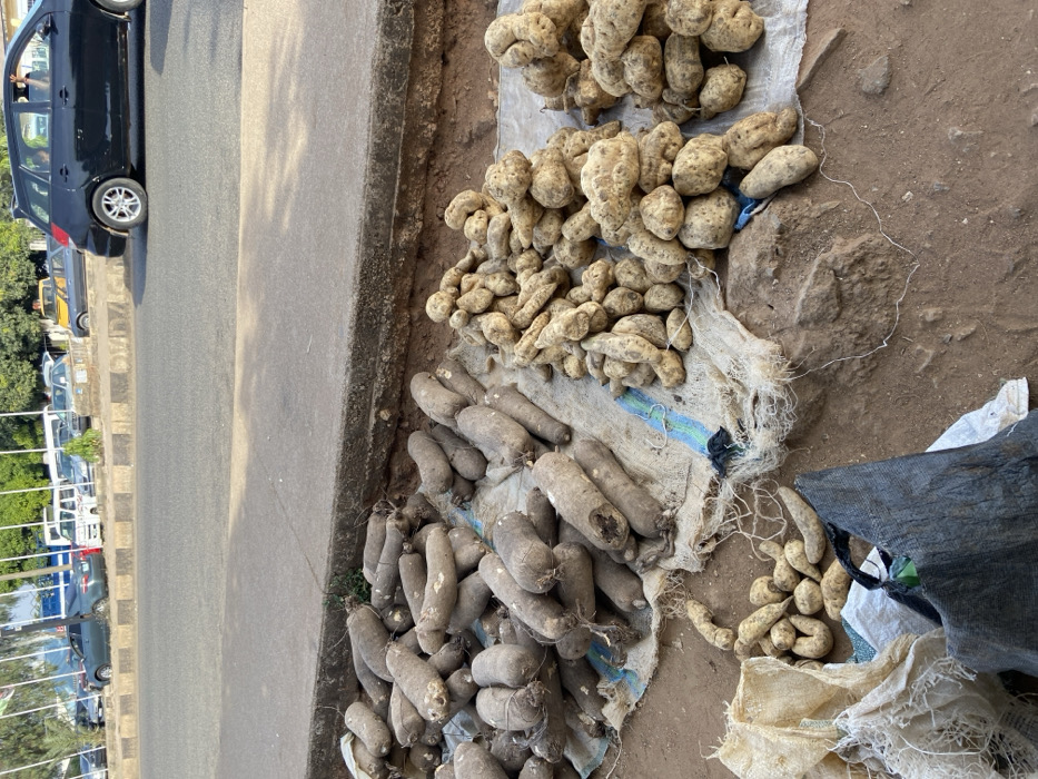 The image depicts a roadside market display in Jos, Nigeria