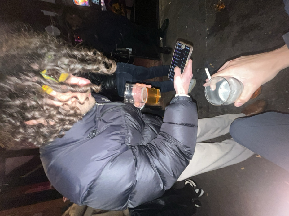 The image captures a dimly lit indoor scene within a bar, located in Paris, France, from a low-angle, first-person perspective. In the central midground, a male subject with voluminous dark, curly hair and apparent yellow-green eyewear pushed onto his head is depicted. He wears a dark navy puffer jacket, a light-colored long-sleeved shirt, and light beige trousers, paired with brown shoes. His right hand holds a clear glass containing an amber liquid (likely beer), while his left hand is extended, holding a dark smartphone with an illuminated screen displaying a grid of small icons or data points. In the immediate foreground, the hands and partial leg of the person taking the photograph are visible. This individual wears dark trousers and holds a clear glass containing a small amount of cloudy liquid in their left hand. A lit cigarette is held between their fingers, resting against the rim of the glass. In the background, several other individuals are partially visible and out of focus. To the right of the central male, a person in dark attire, possibly a leather jacket and jeans, is partially seen from behind. Further right, a darker silhouette of another individual is present near indistinct colored lights, potentially from an arcade machine or electronic display. On the far left, the lower body and feet, featuring white shoes, of another person are briefly visible. The floor is dark and reflective, and faint wooden structural elements are discernible in the upper background.