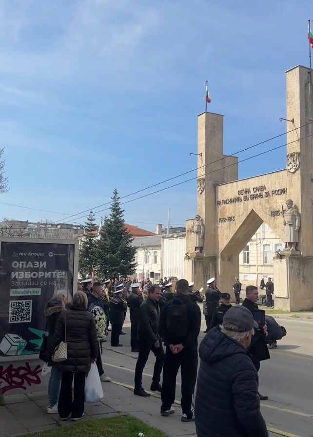 daytime view of a public gathering in front of a monument under a clear, blue sky. The monument, made of light-colored stone, is marked with inscriptions in a Slavic language and topped with Bulgarian flags. A group of people, many dressed in dark clothing, stand on a sidewalk. Some are wearing naval uniforms with white hats. A person carries a wreath with white flowers towards the monument. A billboard displays text in a Slavic language and a QR code. People are moving around and looking toward the monument. A Christmas tree can be seen behind the group of people.