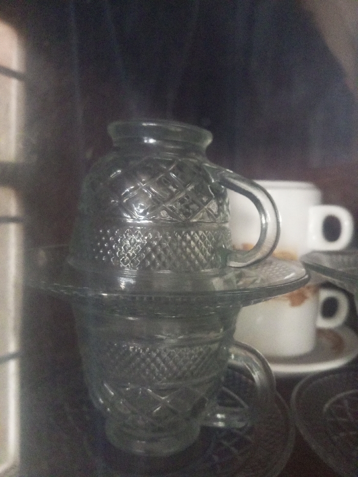 - "A stack of gray glass teacups and saucers with a textured diamond pattern is visible" by FM-0hW0q2, licensed under CC BY 4.0