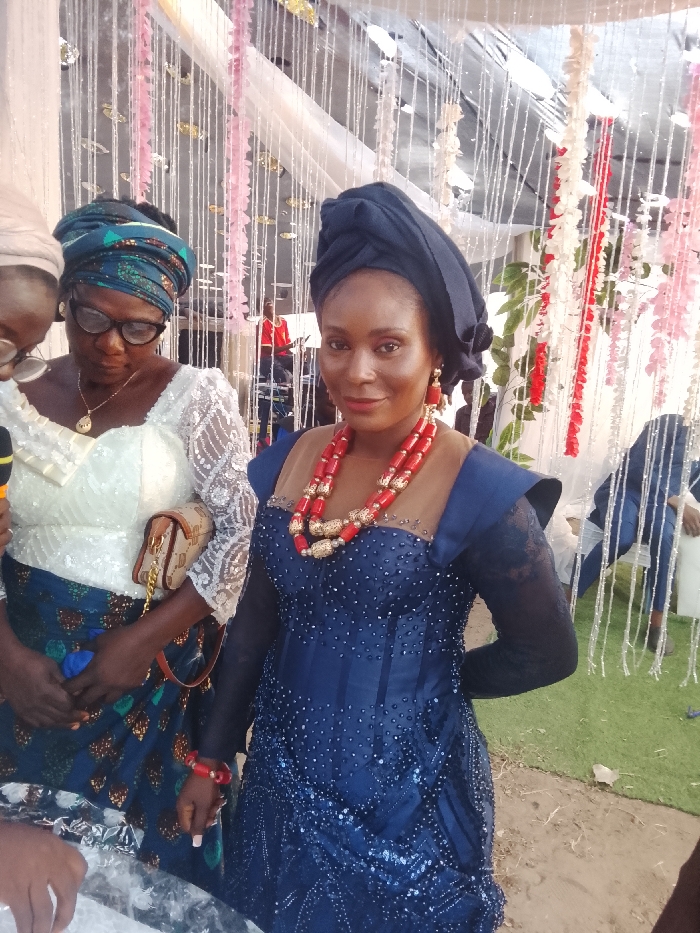 Two women stand in front of a backdrop of shimmering white and pink garlands. The woman on the right wears a dark blue, beaded dress with a sheer neckline and a matching headwrap, accented by a coral and gold necklace. The woman on the left wears a white lace top with a patterned skirt and a blue and green patterned headwrap, adorned with a gold necklace. Both women are elegantly dressed, possibly for a special occasion.