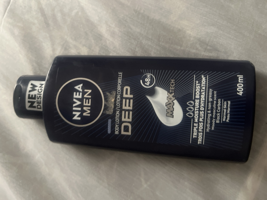 - "A dark blue Nivea Men Deep Body Lotion bottle, 400ml, with a black flip-top cap, is positioned centrally on a light-colored, textured fabric surface, likely a bedsheet" by FM-pcboy1, licensed under CC BY 4.0