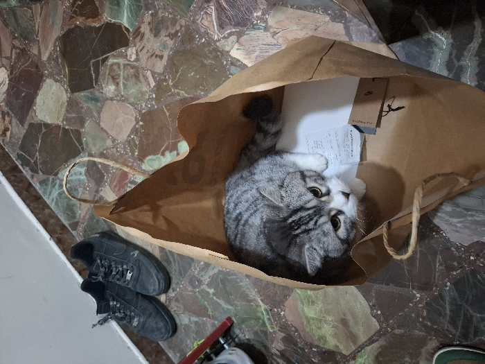 A gray and white tabby cat lies upside down in a brown paper shopping bag. Inside the bag are a white sheet of paper, a receipt, and a cardboard tag. The bag sits on a floor with a marble pattern. A pair of black shoes are near the bag's opening, resting partially on a white surface. A red object with wheels is partially visible at the bottom of the image.