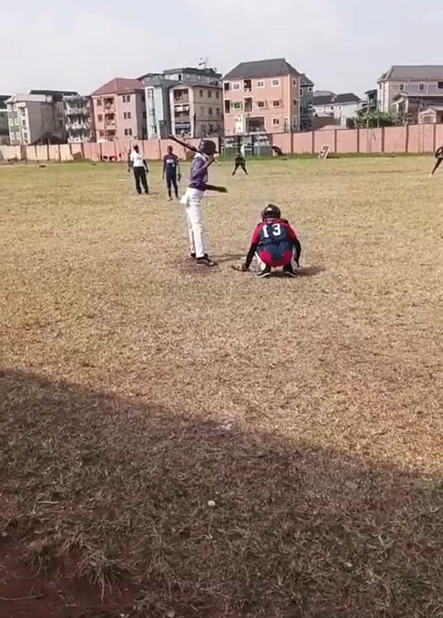 The video depicts a baseball game on a grassy field. A batter, wearing a purple jersey and white pants, stands at home plate. He swings the bat and drops it. A catcher, wearing black and red gear, stands behind the batter. Other players and coaches are visible in the background. The field is surrounded by buildings and a fence. The sky is blue with some clouds. The field appears to be dry and slightly patchy.