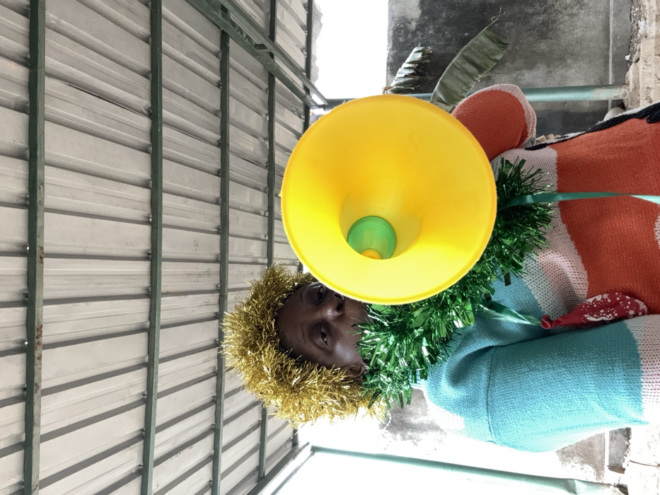 An individual is depicted in Sabon Tasha, Nigeria, positioned beneath a corrugated metal roof supported by green metal beams. The person wears a gold tinsel headpiece and a green tinsel garland around their neck, over a multi-colored knitted sweater featuring light blue, white, and orange sections. A deflated red balloon with white polka dots is attached to the sweater via a green ribbon. The individual holds a bright yellow plastic megaphone with a green inner cone to the left side of their face, partially obscuring it. A concrete wall and a large green leaf, consistent with a banana plant, are visible in the background to the right of the subject.