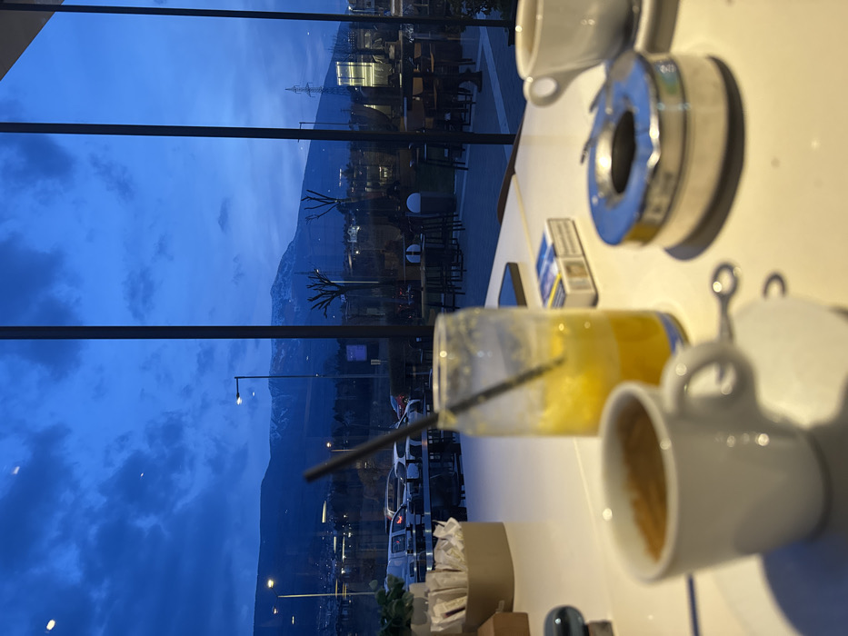 The image presents an interior view from what appears to be a cafe or restaurant, looking out through large, multi-paned windows at dusk or early night