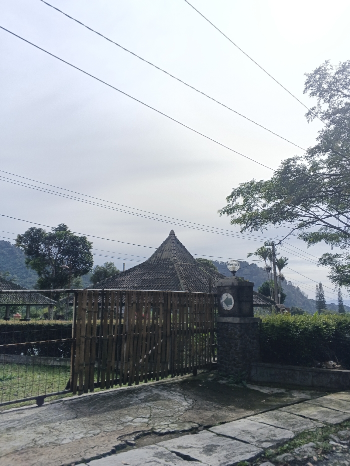 A landscape features a traditional building with a tiled pyramid roof, visible behind a bamboo gate and stone pillar. A decorative light fixture sits atop the pillar. Lush greenery surrounds the scene, including trees and manicured hedges. Overhead, power lines stretch across a cloudy sky. The foreground consists of a paved path, cracked and weathered. A distant mountain is visible in the background.