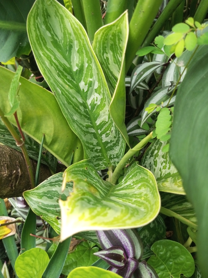 The scene is a close-up view of dense plant foliage located in Mindat, Myanmar. The image is dominated by various green plants. Multiple large, lanceolate leaves display variegation in shades of light green, dark green, and silvery-white. The central variegated leaf is in sharp focus, exhibiting distinct striped and blotched patterns. Several of these variegated leaves show evidence of minor insect damage, characterized by small perforations. Interspersed throughout the foliage are leaves with prominent silver and dark green stripes, and a distinct leaf section with dark purple and black striped patterns is visible near the bottom. Smaller, uniformly green leaves are also present. A brown, fibrous organic object is partially visible on the left edge of the frame. No individuals, fauna, or artificial structures are present within the scene.