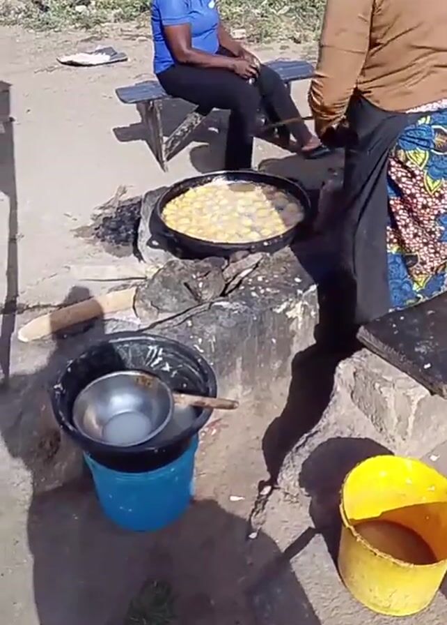 Two women are outdoors preparing food. One woman, dressed in a blue shirt and black pants, sits on a wooden bench holding a small dark object. The other woman, wearing a brown shirt and a colorful patterned apron, stands in front of a cooking setup, using a slotted spoon to move food frying in a large pan over a stone hearth. A black bucket, topped with a smaller metal bowl and a wooden stick, is next to the hearth, along with a yellow bucket. The ground is concrete, and in the background is an area of dry grass and trash.