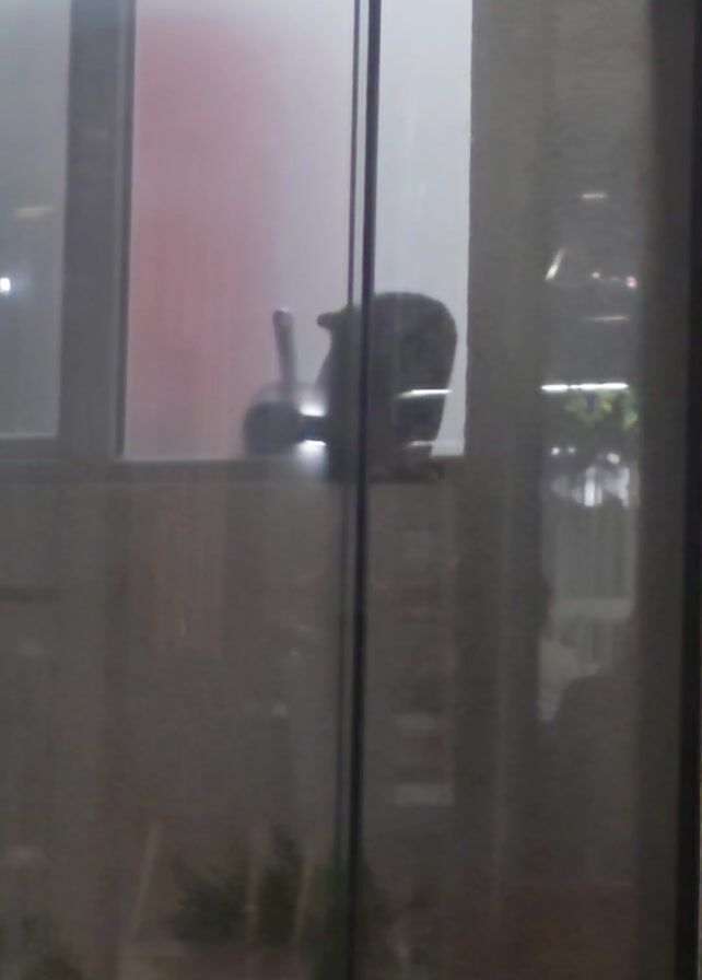 view through a window. Inside the window is a dark colored chair, a desk lamp, and a pink wall. The outside of the window appears to be an outdoor space with vegetation. There is audio of people speaking in a foreign language.
