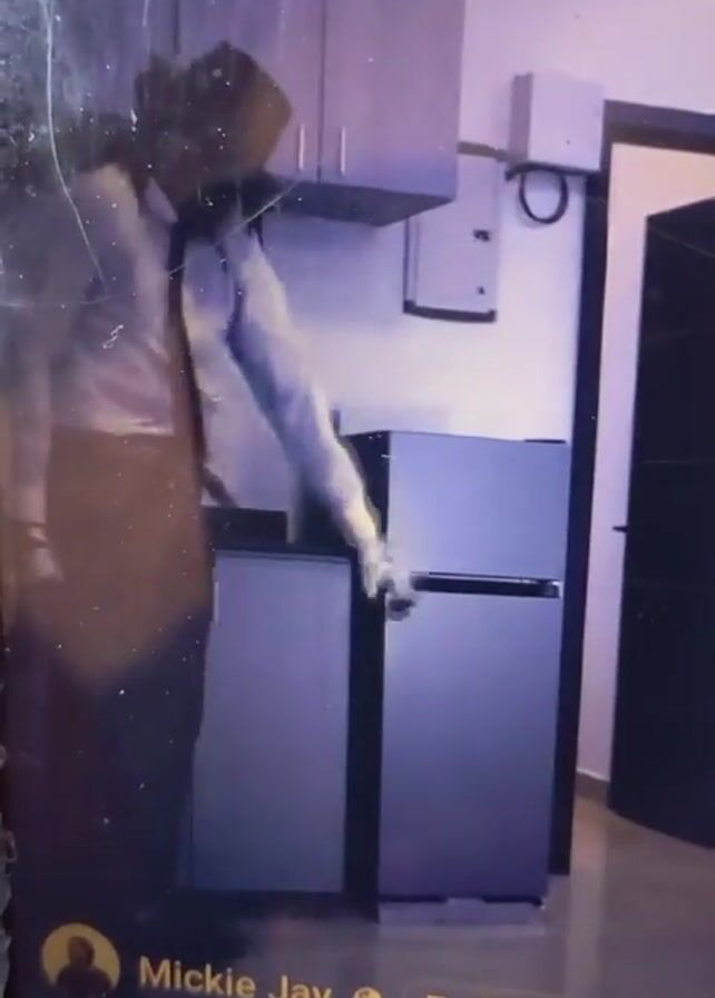A person dressed as Michael Jackson stands in a kitchen. The person is wearing a hat, white shirt, red tie, black pants, and black shoes. They are striking a pose with their right hand in their pocket and left arm extended. There is a refrigerator and kitchen cabinets visible in the background. A doorway is to the right of the refrigerator. The video is labeled as POV: Michael Jackson In That One Performance.