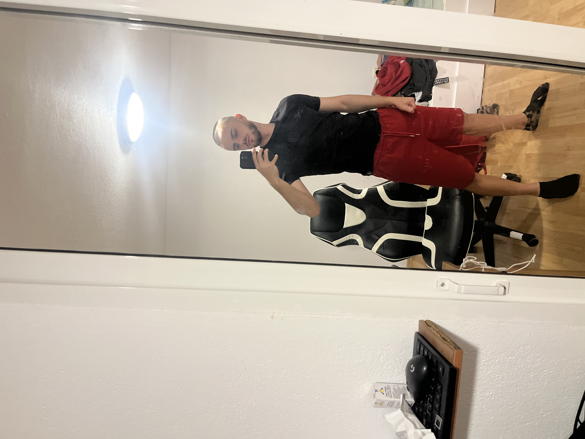 A man is seen in a mirror. The man has a short haircut and a beard. He is wearing a black T-shirt and red shorts. The man is holding a cell phone and taking a picture of himself. He is standing in a room. A black and white chair is visible in the room behind him.