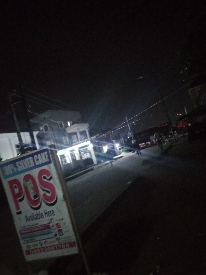 Night scene with streetlights illuminating a road in front of a two-story building. A sign for "100% Silver Cake POS" stands prominently on the left, advertising payment services and a phone number. Figures of people are walking along the dimly lit street. The background includes power lines and other buildings, adding to the urban landscape. The image is dark and the lighting is poor, making it difficult to see details clearly.