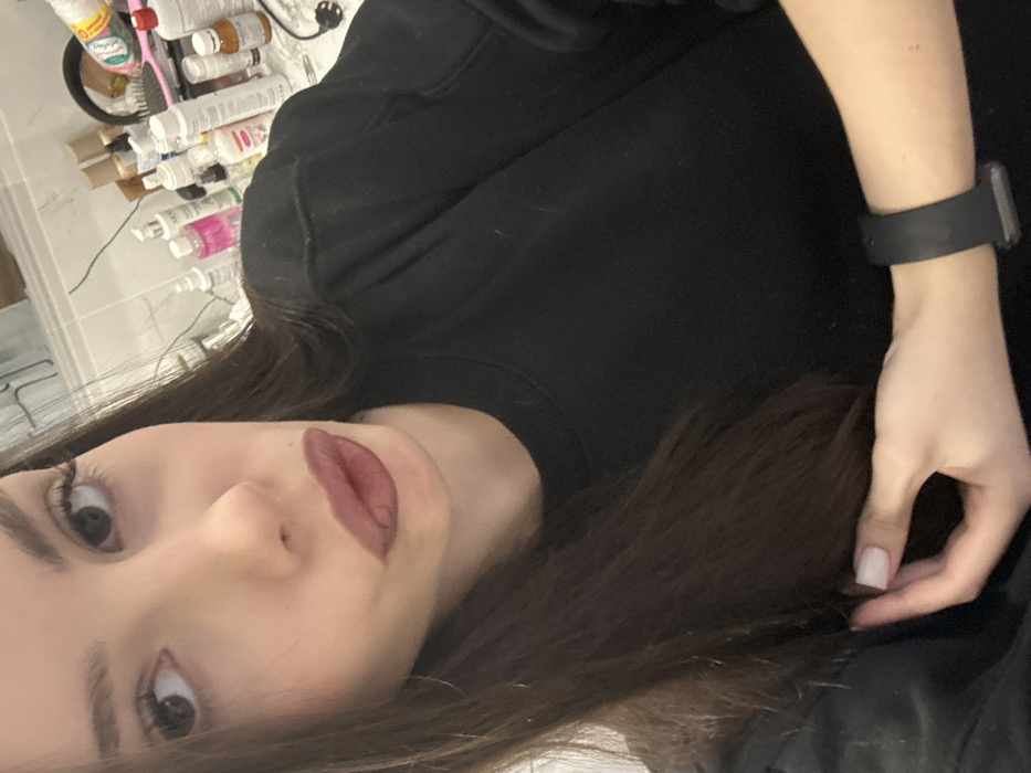 An image taken in Novosergievka, Russia, depicts a female subject positioned in what appears to be an indoor setting, possibly a bathroom or vanity area. The subject, viewed from the chest up, has long, dark brown hair, fair skin, and is wearing dark reddish-brown lipstick. Her gaze is directed towards the camera. She is dressed in a plain black long-sleeved crew-neck sweatshirt. Her right hand, exhibiting light-colored nail polish, is gently touching strands of her hair near her left shoulder. A dark-colored smartwatch with a rectangular face is visible on her left wrist. The background behind the subject reveals a cluttered surface, likely a counter, laden with numerous cosmetic and personal care products, including various bottles, jars, and a pink hairbrush. A segment of a wall, possibly tiled, is also visible.