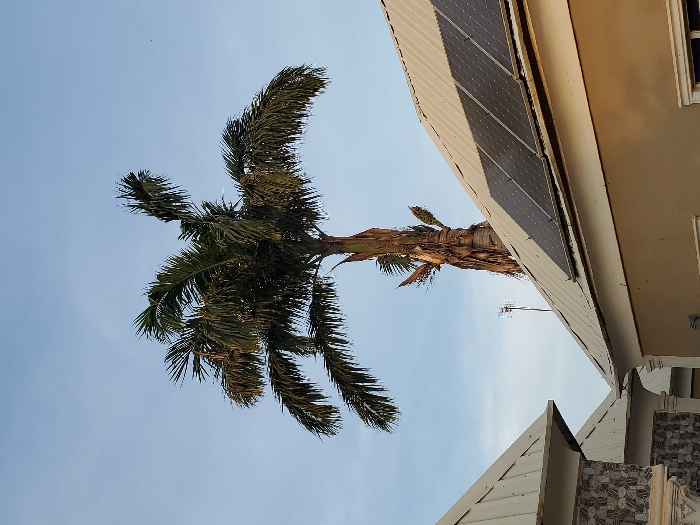 A palm tree dominates the frame against a light blue sky. A section of a building with solar panels is visible in the upper right. An antenna is seen along the roofline. A white-roofed structure with decorative tiling is in the lower right corner, partially obscured. The perspective is angled upwards towards the sky.
