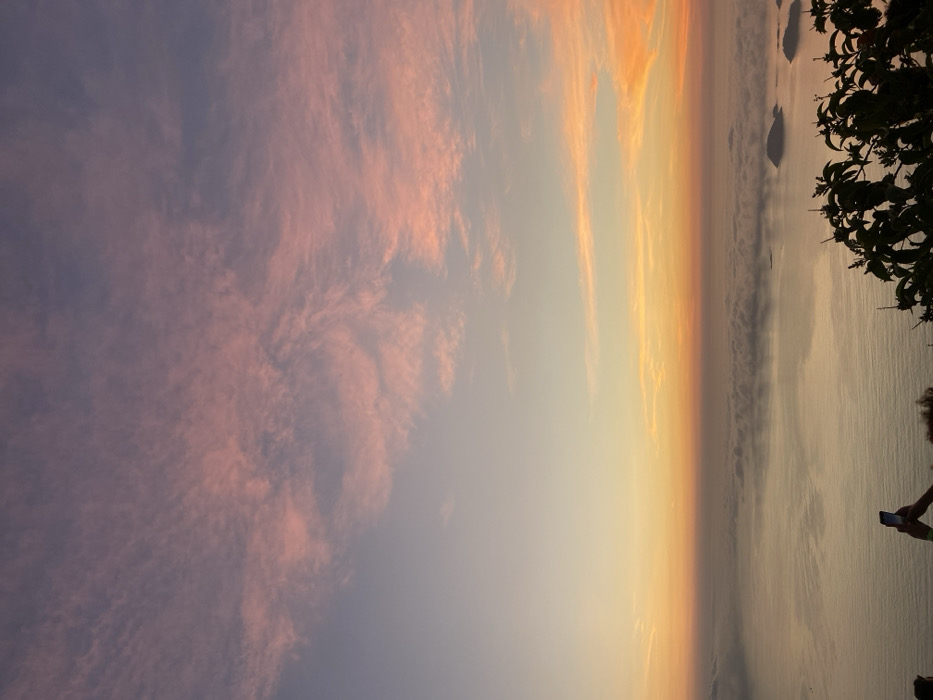 A scenic sunset over the ocean. To the left, the sky is filled with wispy, pink-hued clouds. As the sun sets, the sky transitions to orange and yellow hues above the water. The sea appears calm and reflects the colors of the sunset. A silhouette of trees and a person with a phone are visible in the lower right corner of the image.