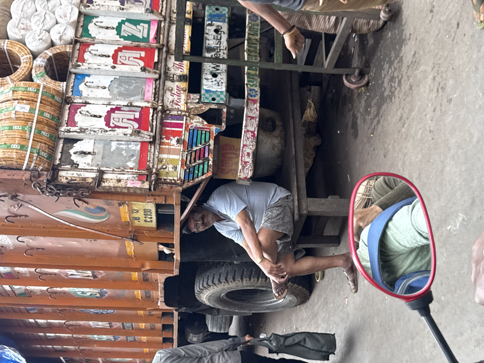 The image depicts a daytime street scene in a commercial area of Kolkata, West Bengal, India. The location is confirmed by a "WB 33 C2190" license plate visible on the side of a large, weathered orange cargo truck. The dominant subject is the truck, which has a distinctively decorated rear section featuring colorful painted panels with stylized letters "A" and "Z," geometric patterns, and text including "Follow Th," "WheelsEye," "STOP," and "SAFE DRIVE SAVE LIFE." The truck's bed is partially loaded with numerous cylindrical bundles, likely rattan or wicker, and several white, fabric-wrapped bundles. Underneath the truck's rear, a middle-aged man with a mustache and glasses is seated on a simple wooden bench. He wears a light blue striped polo shirt, camouflage-patterned shorts, and brown sandals, with a gold-colored watch on his left wrist. His legs are crossed, and he gazes towards the camera. To the left of the frame, the lower torso and legs of an individual wearing a grey long-sleeved shirt and dark pants are visible, carrying a dark green shoulder bag. On the far right, a dark-skinned arm with a light-colored bracelet is seen, with the hand pointing downwards. A portion of a metal handcart with a wheel is also visible on the right. In the foreground, a red-framed motorcycle mirror reflects the torso of a person wearing a light green shirt and a blue shoulder strap. The ground consists of worn, dark-colored pavement with minor debris. A small, empty yellow bowl rests near the feet of the seated man. A large metal basin or pot is positioned on the ground under the truck's rear.