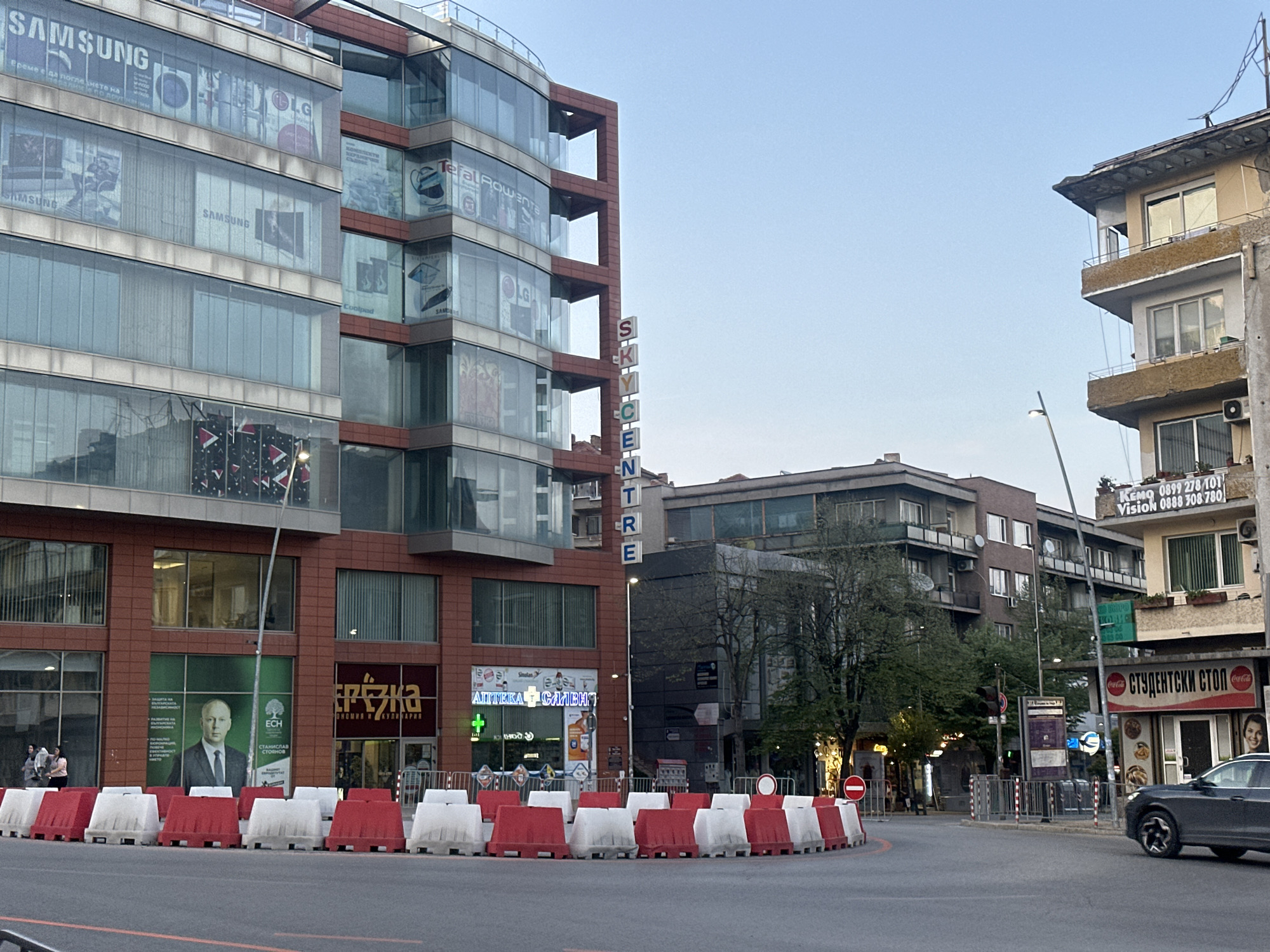 The image is an eye-level street view in Veliko Tarnovo, Bulgaria. A modern, multi-story commercial building with glass and red-brown paneling dominates the left side of the frame. The building is adorned with advertisements for brands like Samsung, LG, and Tefal Rowenta. It has a vertical sign that reads "SKYCENTRE" along its edge. At street level, there's an advertisement for "ECH Станислав Стоянов", next to a storefront with the Cyrillic text "ТРЪЖКА". Adjacent to that is a pharmacy, "АПТЕКА САЛВИТ". Red and white road barriers are arranged in a semi-circle, suggesting traffic rerouting. Across the street, there are older residential buildings. The one on the right side has a sign in Cyrillic that translates to "STUDENT CAFETERIA" with a Coca-Cola logo above it. A dark-colored car is driving on the right side of the image. There are also street lights, trees, and other urban elements. The sky is a clear blue.