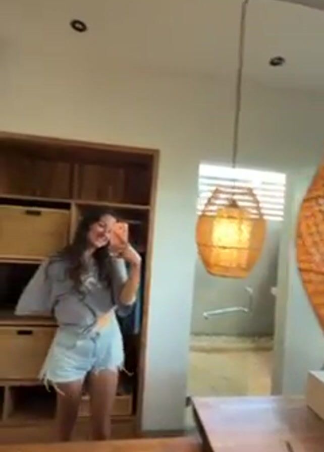 A young woman is taking a selfie in a bathroom mirror. She is wearing a gray t-shirt tied at the waist and light blue denim shorts. Her hair is long and wavy. Behind her in the mirror is a wooden closet with woven baskets and a shower area with white tile and gravel flooring. Above the sink area hangs an orange woven pendant light. The bathroom has light walls and natural wood accents. The woman smiles at the camera.