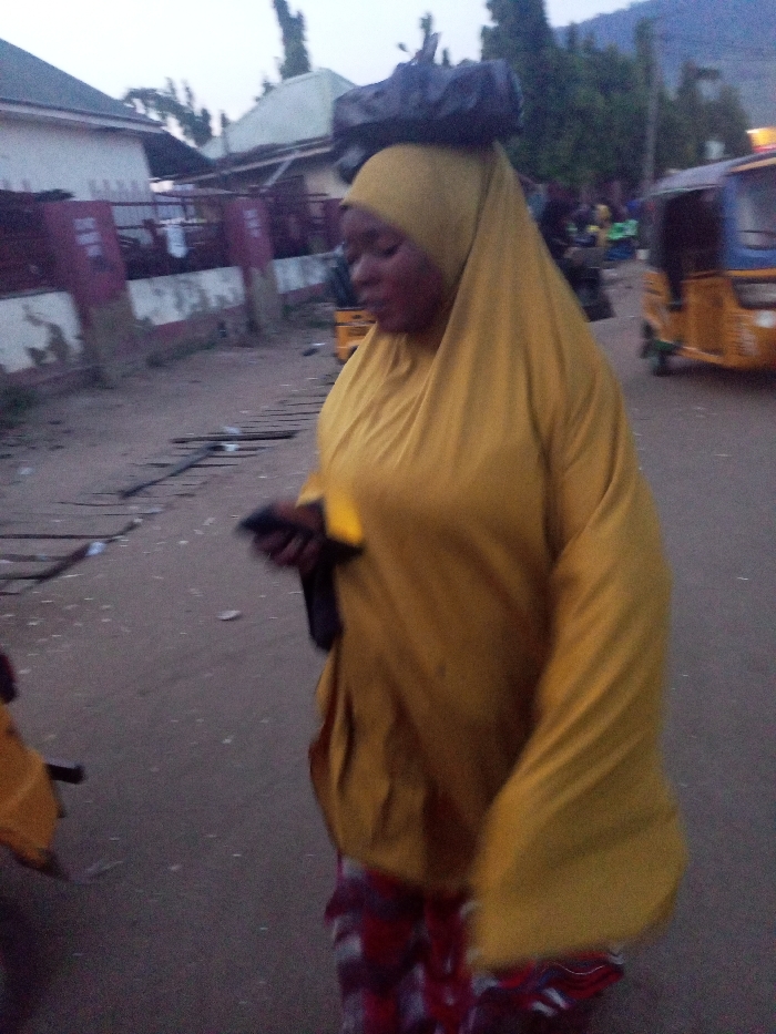 A woman in a yellow hijab carries a black bag on her head while walking on a dirt road. She holds an electronic device in her hand. Buildings, fences, and trees line the side of the road in the background. Yellow auto-rickshaws are also visible. The image has an overcast lighting, suggesting it may be early morning or late evening. Her red-and-white patterned trousers are visible under her robe.