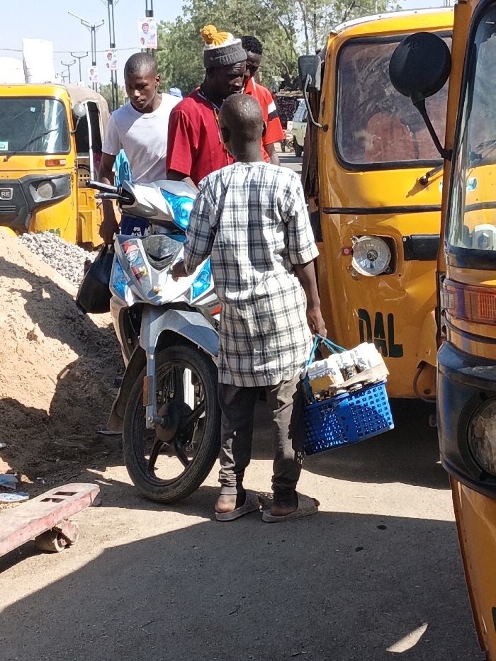 This image depicts an outdoor scene in Gama, Nigeria, characterized by bright sunlight