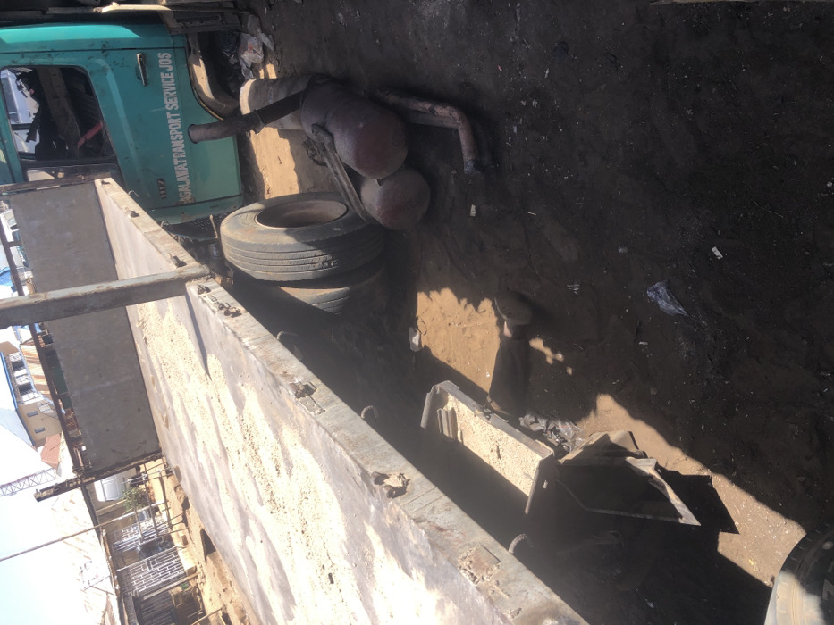 The image depicts a teal-colored flatbed truck in a state of disrepair or maintenance, situated on a dirt ground in Kufena, Nigeria