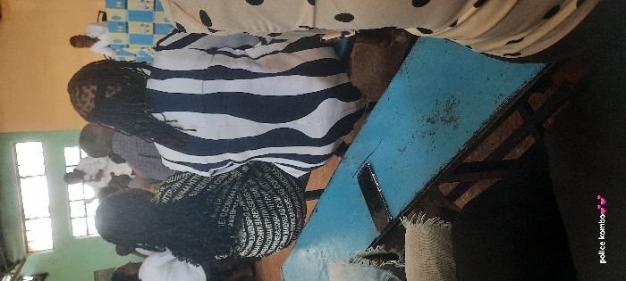 The scene depicts an indoor gathering, likely a public event, seminar, or religious service, viewed from the perspective of an attendee seated within the audience. The exact location within Unknown, Kenya, cannot be visually determined. In the foreground, a worn, light blue wooden bench or desk is visible, upon which a dark-colored smartphone rests flat. Three individuals are partially visible from behind, seated in front of this bench. The person on the left wears a dark garment patterned with repeated white text, including "HTTP://WWW.BAREENSEAG.COM". The central figure has dreadlocks and is dressed in a white top featuring prominent vertical black stripes. A third individual on the far right is partially obscured, wearing a light-colored garment with dark polka dots. In the background, numerous other individuals are seated, facing a raised platform or stage area. On this platform, two males are present. One male, dressed in a white shirt, stands and appears to be speaking, with his right arm raised in a gesture. Another male, also in a white shirt, is seated behind a table draped with a blue and white checkered cloth. The room's background wall is painted light green on the upper section and a lighter, possibly yellow or cream, color below. Multiple rectangular windows are visible near the top of the wall, providing natural illumination. The floor appears to be a reddish-brown tone.