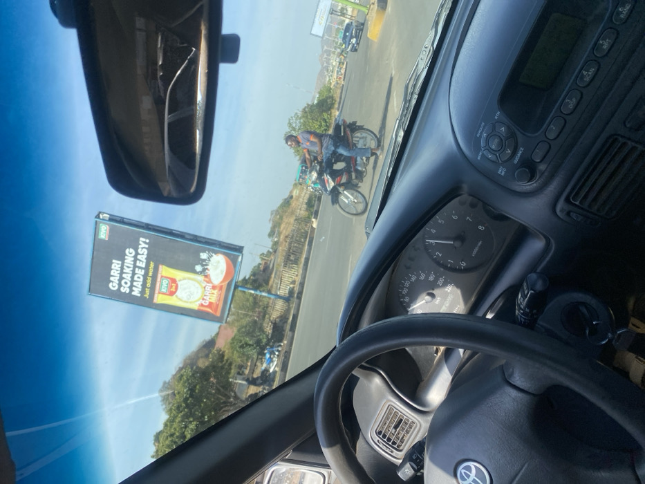The image depicts a daytime scene from the interior of a vehicle, looking out through the windshield onto an urban setting in Jos, Nigeria. In the immediate foreground, the black steering wheel of a Toyota vehicle, part of the dashboard including a speedometer displaying zero, and car keys inserted into the ignition are visible. A rearview mirror hangs centrally, reflecting portions of the car's interior. Outside the vehicle, on a paved road, a male individual with a beard, wearing a blue polo shirt and dark trousers, is seated on a black motorcycle, positioned facing generally right relative to the camera. His feet are resting on the ground, suggesting the motorcycle is stationary. To the left of the road, a large vertical billboard displays an advertisement for "Kivo Garri Mix," with prominent text reading "GARRI SOAKING MADE EASY! Just add water." The billboard shows the product packaging and a bowl of prepared garri. Further in the background, a series of hills with sparse vegetation are visible under a clear blue sky. Roadside fencing and other distant vehicles are discernible along the thoroughfare, which appears to be a major road or intersection within the city.