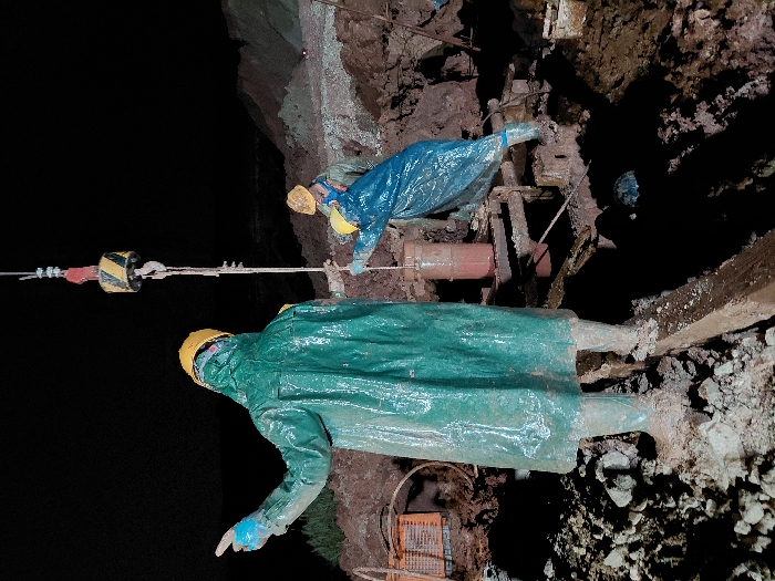 Two workers in yellow hard hats and protective gear operate equipment in a muddy construction site at night. One worker is in the foreground wearing a long green raincoat, while the other wears a blue covering. A thick cable extends from a safety mechanism to the left of the frame. The backdrop is a dark excavation area with exposed soil. The scene is illuminated by artificial lighting.