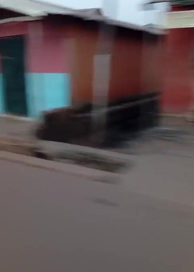 quick street-level perspective. It appears to be filmed while moving, possibly from a vehicle, passing by a series of buildings and structures along a street. The buildings are of various sizes, colors, and materials, including brick, cement, and corrugated metal. One structure displays a mural. A person wearing blue pants walks by. The street is paved, and there's a shallow drainage ditch alongside it. The sky is overcast. The video quality is blurry due to the speed and motion.