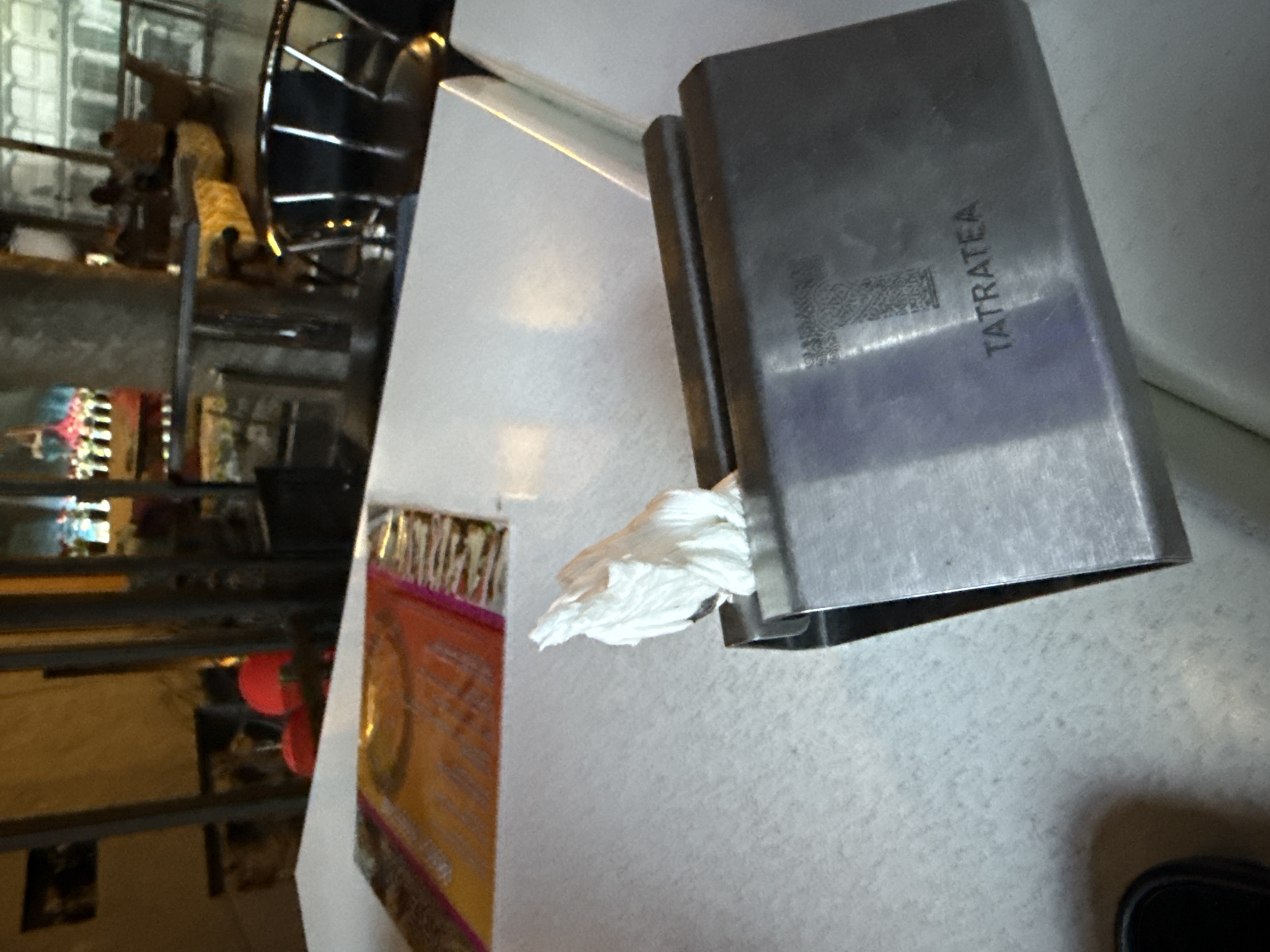 A metal napkin holder with the word "TATRATEA" printed on it sits on a white table next to a menu